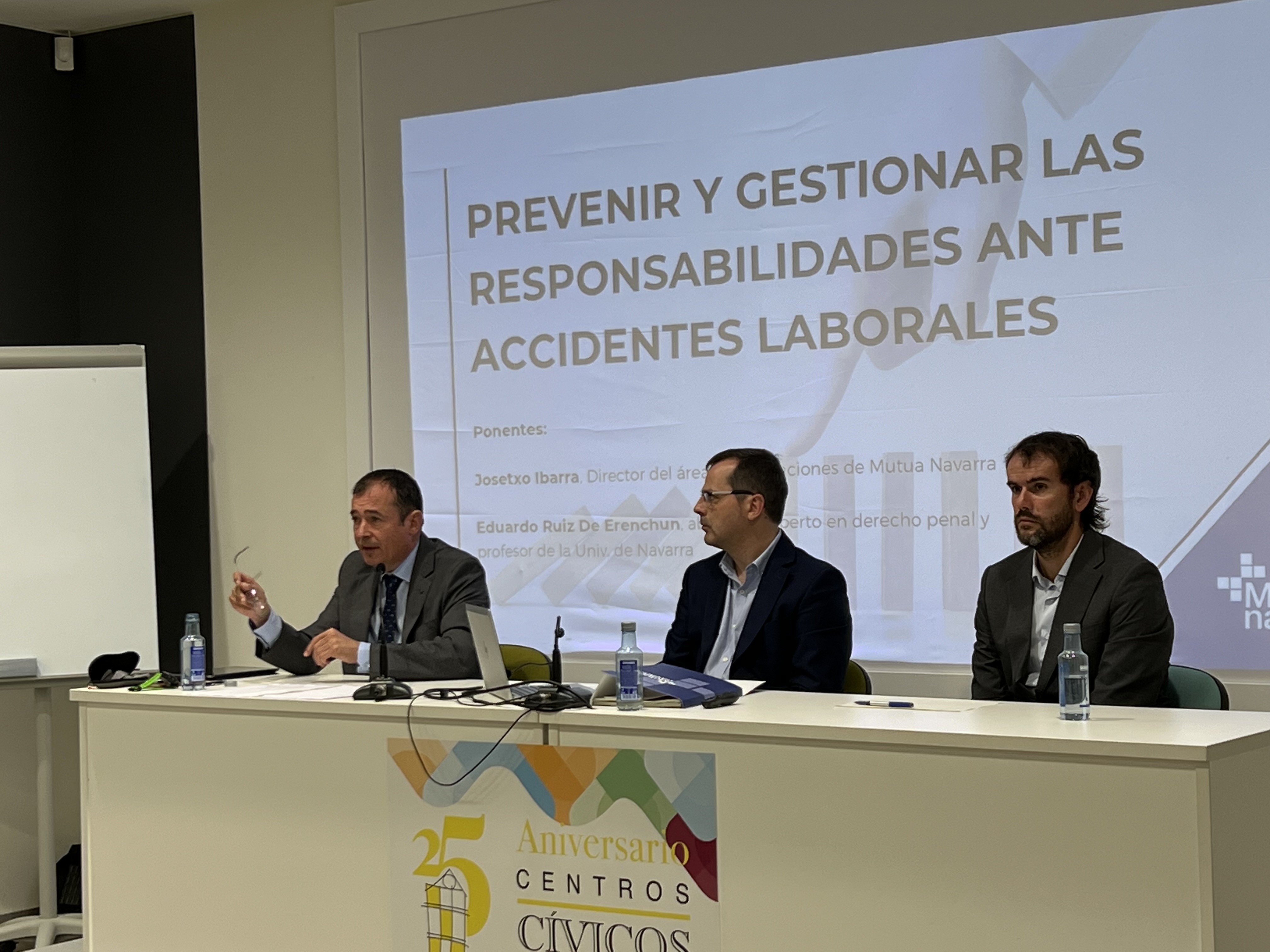 Mutua Navarra organizó ayer en Tudela una charla sobre “Prevenir y gestionar las responsabilidades ante accidentes laborales”. La jornada contó con las ponencias de Josetxo Ibarra, director del Área de Prestaciones de Mutua Navarra y Eduardo Ruiz de Erenchun, abogado experto en Derecho penal y profesor de la Universidad de Navarra.