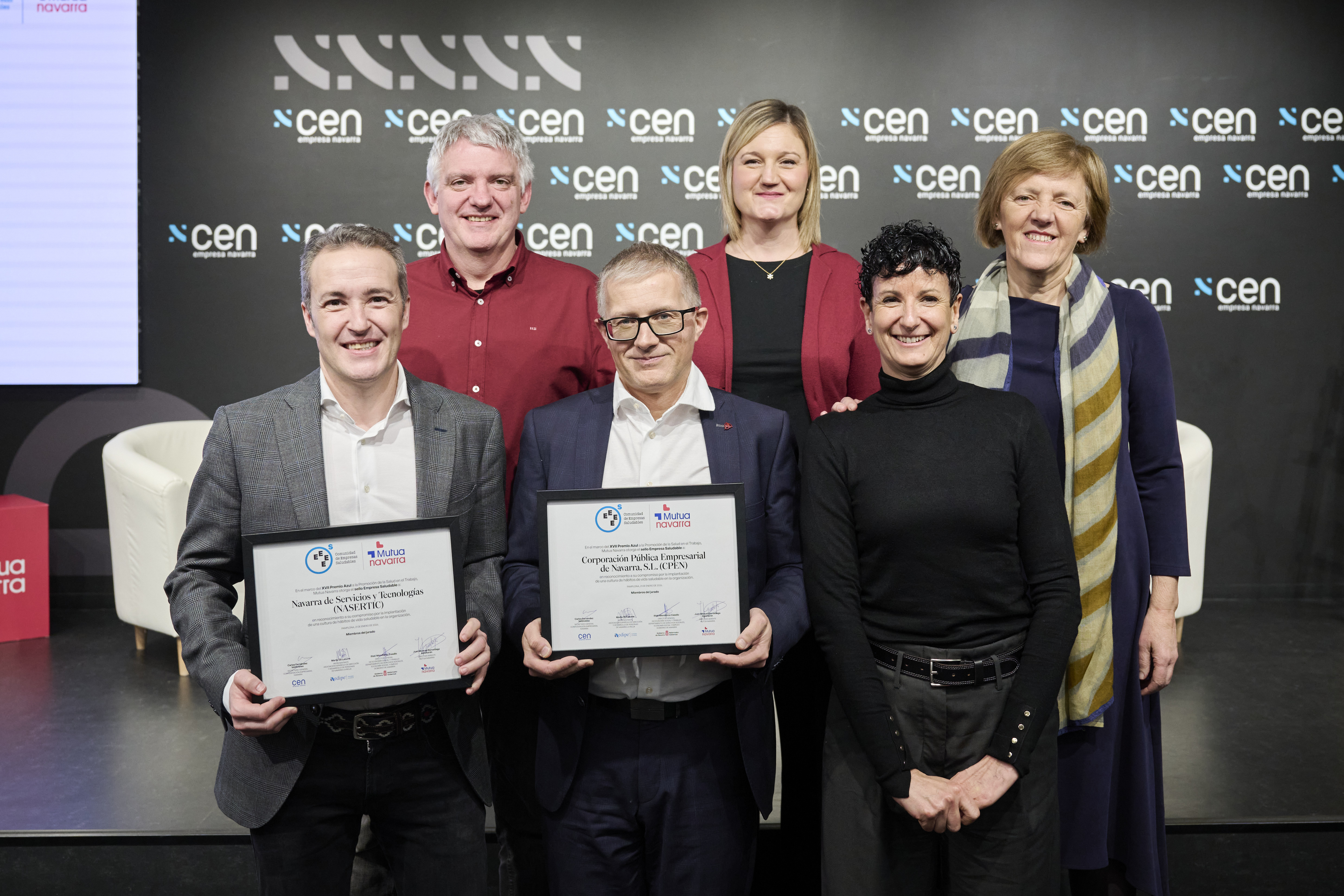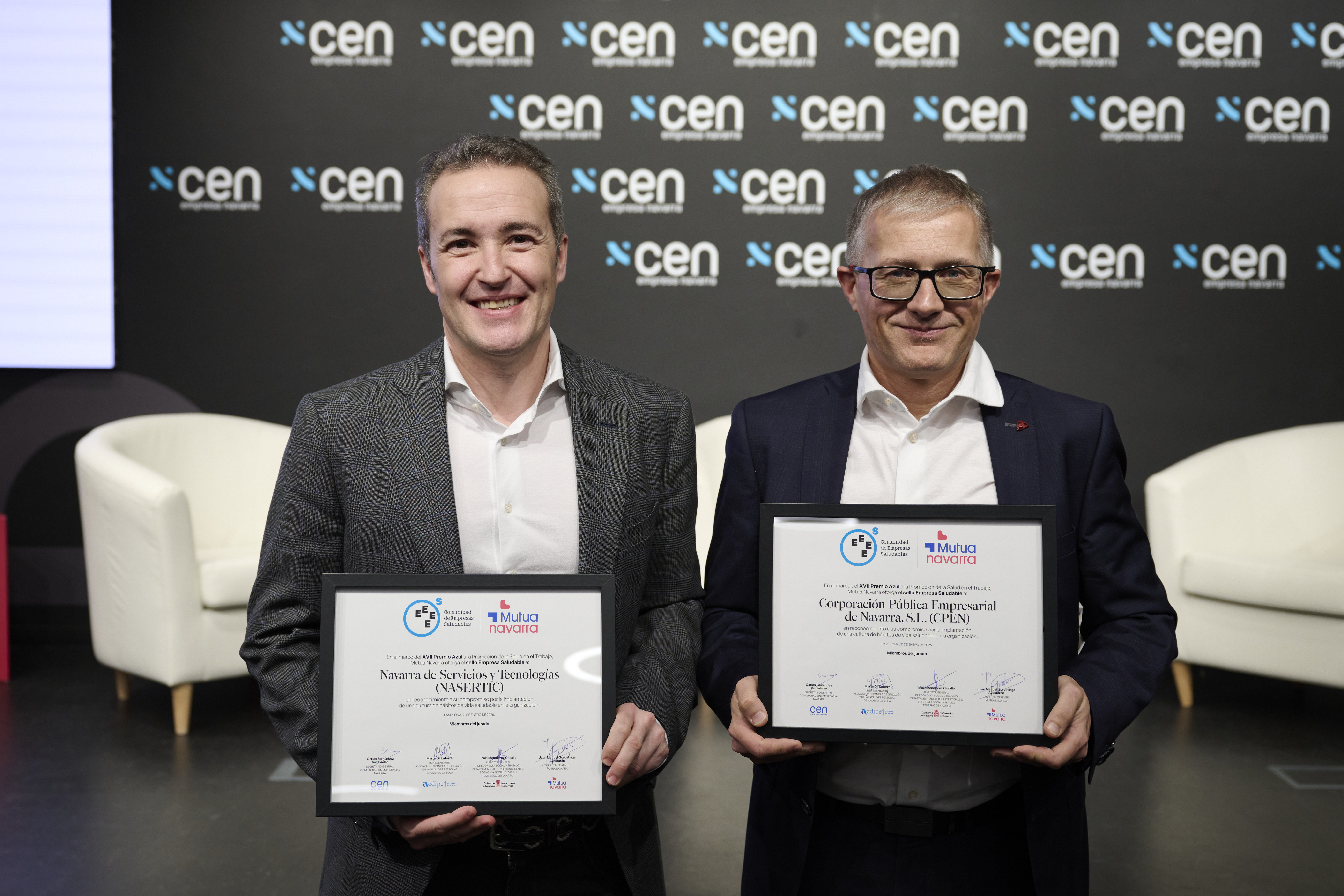 En el acto, otras nueve empresas navarras han sido reconocidas con el Sello Azul por su compromiso con la promoción de la salud y el bienestar en el trabajo en 2025. Estas son: Electricidad Neumática JP, S.L., Perap Mantenimientos Industriales, S.L., Poliuretanos Aismar S.A., Agenor Mantenimientos, S.A., Balneario Elgorriaga, S.L., Corporación Pública Empresarial de Navarra, S.L. (CPEN), Fundación Elkarkide Fundazioa, Navarra de Servicios y Tecnologías (NASERTIC) y Transforma Cuidamos Personas, S.L.